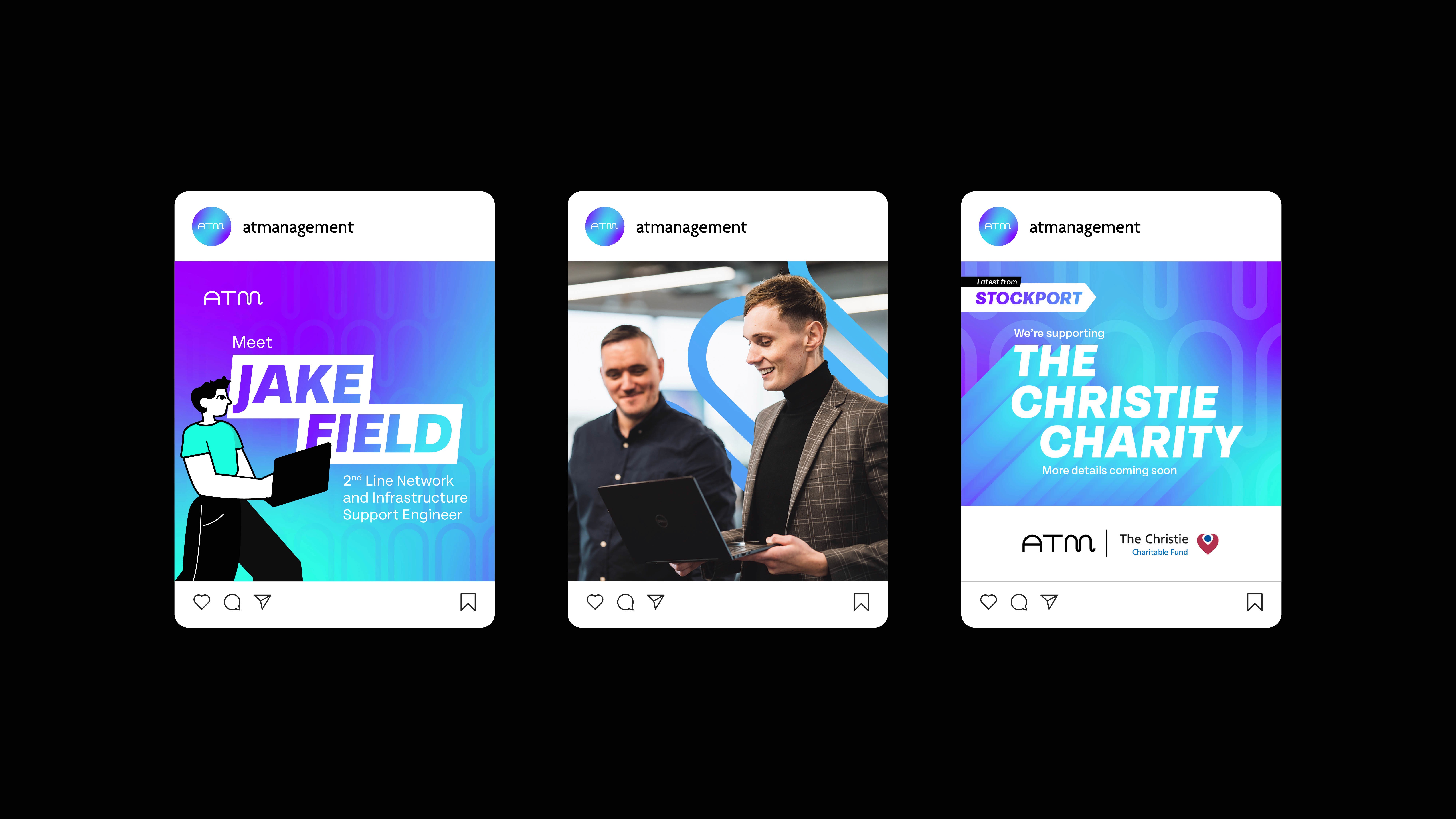 We saw a need for ATM’s rebrand to represent the businesses internal culture more accurately, and so injected personality and vibrancy into the look and feel through the addition of playful illustrations, dynamic gradients and bold typography. Since working on the brand evolution, we then created a social media strategy alongside a monthly social media calendar and blog post structure with the aim of increasing ATM’s online presence which we successfully achieved, seeing an increase in ATM’s LinkedIn following by 200% (and counting).